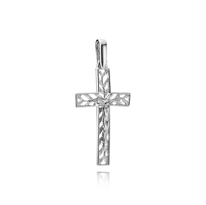 Unikt kors vedhæng i ægte sterling sølv (925) med smukke udskæringer i bladmønster. Måler 17,5 x 27 mm og kombinerer klassisk symbolik med et dekorativt og let design. Et stilfuldt kors med et elegant, naturinspireret udtryk – perfekt som personlig gave eller til eget brug.