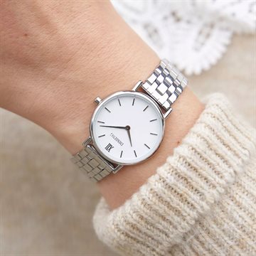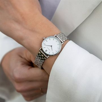 Urets klassiske stil understreges yderligere af dets lænke i rustfrit stål, der matcher den sølvfarvede urkasse og bezel. Den hvide urskive giver et rent og sofistikeret udseende, mens foldelåsen sikrer en sikker lukning. Den overordnede sølvfarve fremhæver det tidløse design. Uret er også vandtæt op til 5 ATM, hvilket gør det til et praktisk valg til daglig brug.