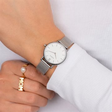 Med en diameter på 30 mm er dette ur perfekt til dem, der foretrækker et diskret tilbehør. Det er vandtæt op til 5 ATM, hvilket gør det egnet til daglig brug. Uret er udstyret med et kvarts urværk, drevet af Seiko VJ20 kaliber. Den rustfrie stållænke og urkasse er i en sølvfarve, parret med en hvid urskive. Uret er sikret med en foldelås, der sikrer komfort og nem brug. Det safirbelagte mineralglas beskytter urskiven.