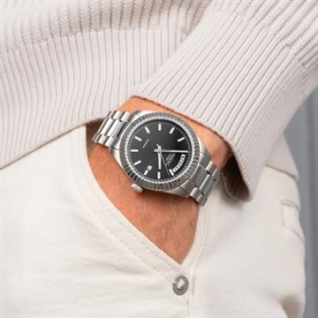 Dissing Day Date D1723 kombinerer klassisk stil med funktionelt design. Det har en rund urkasse med en fluted bezel, der tilføjer et strejf af elegance til udseendet. Den sorte urskive står i flot kontrast til de sølvfarvede markører og visere, hvilket sikrer nem læsbarhed. Dag- og datovisningerne tilbyder praktiske fordele til daglig brug. En lænke i rustfrit stål komplementerer urkassen og giver et sammenhængende og poleret look. Glidelåsen sikrer, at uret sidder sikkert på plads.