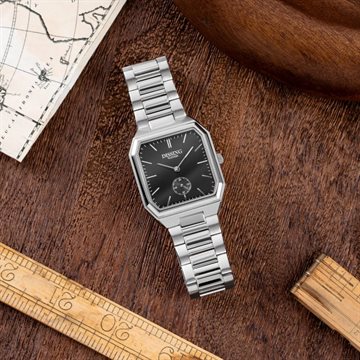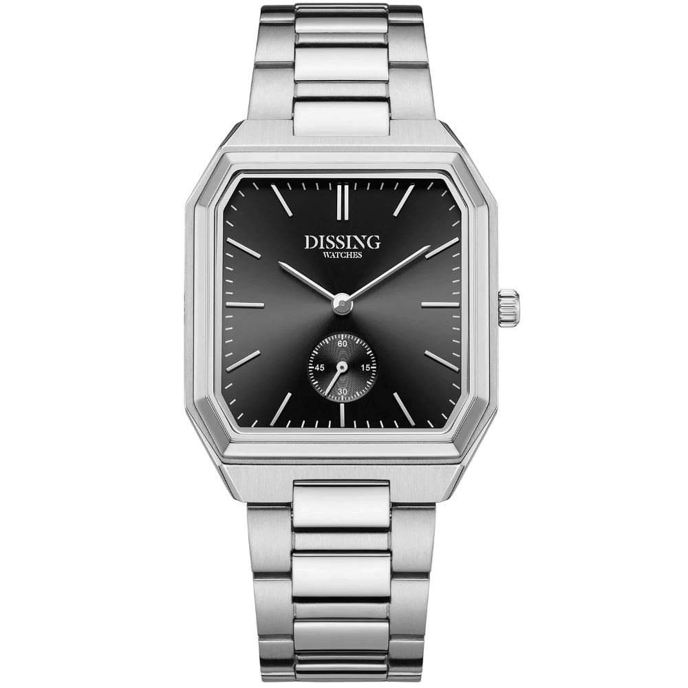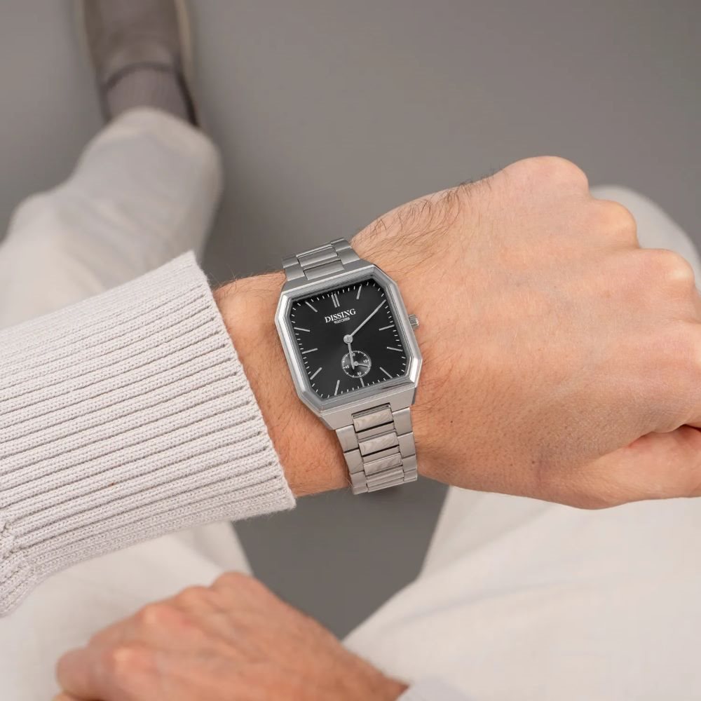 Dissing Heritage D1759 skiller sig ud med sin karakteristiske rektangulære urkasse og moderne design. Den sorte urskive er enkel og har slanke timemarkeringer samt en lille kronograf for ekstra detaljer. En klassisk lænke i rustfrit stål supplerer urkassen og skaber et ensartet udseende. Urkassens sølvfarve, bezel og rem harmonerer smukt, hvilket gør det alsidigt til forskellige lejligheder.