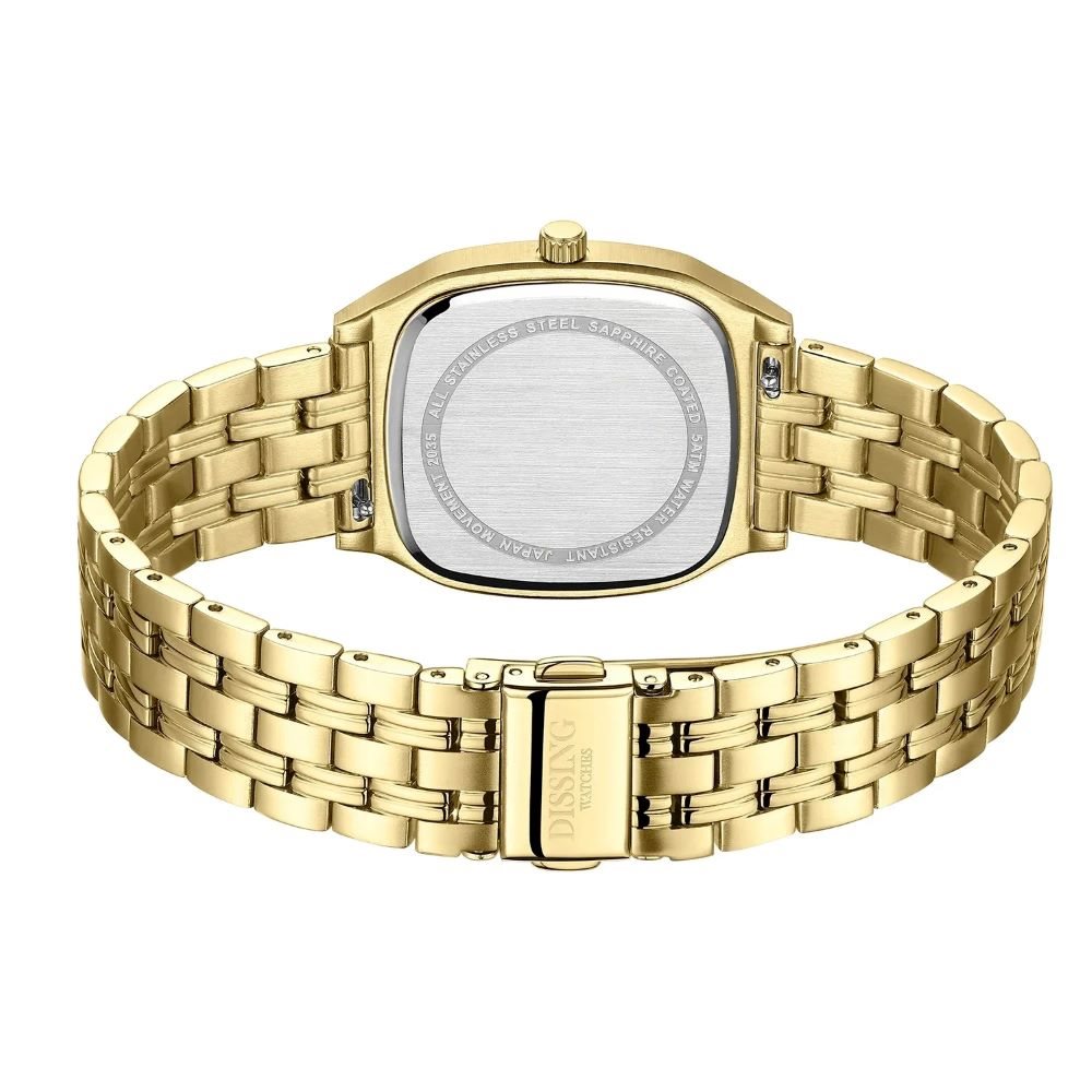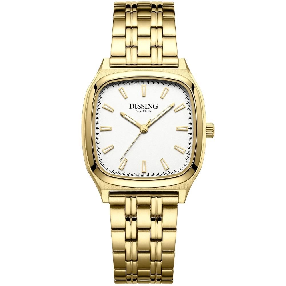 Dissing Petite D1774 tilbyder et unikt og moderne look med sin firkantede urkasse, der har let afrundede kanter. Den rene og enkle urskive står frem mod den hvide urskive, hvilket skaber et klart og elegant udseende. Uret er parret med en flerleddet lænke i rustfrit stål i guld, der tilføjer tekstur og en sammenhængende stil til det samlede design. Den guldfarvede urkasse og bezel fremhæver yderligere urets slanke udseende.