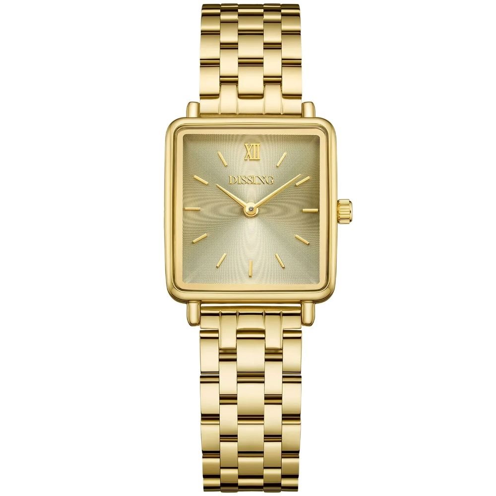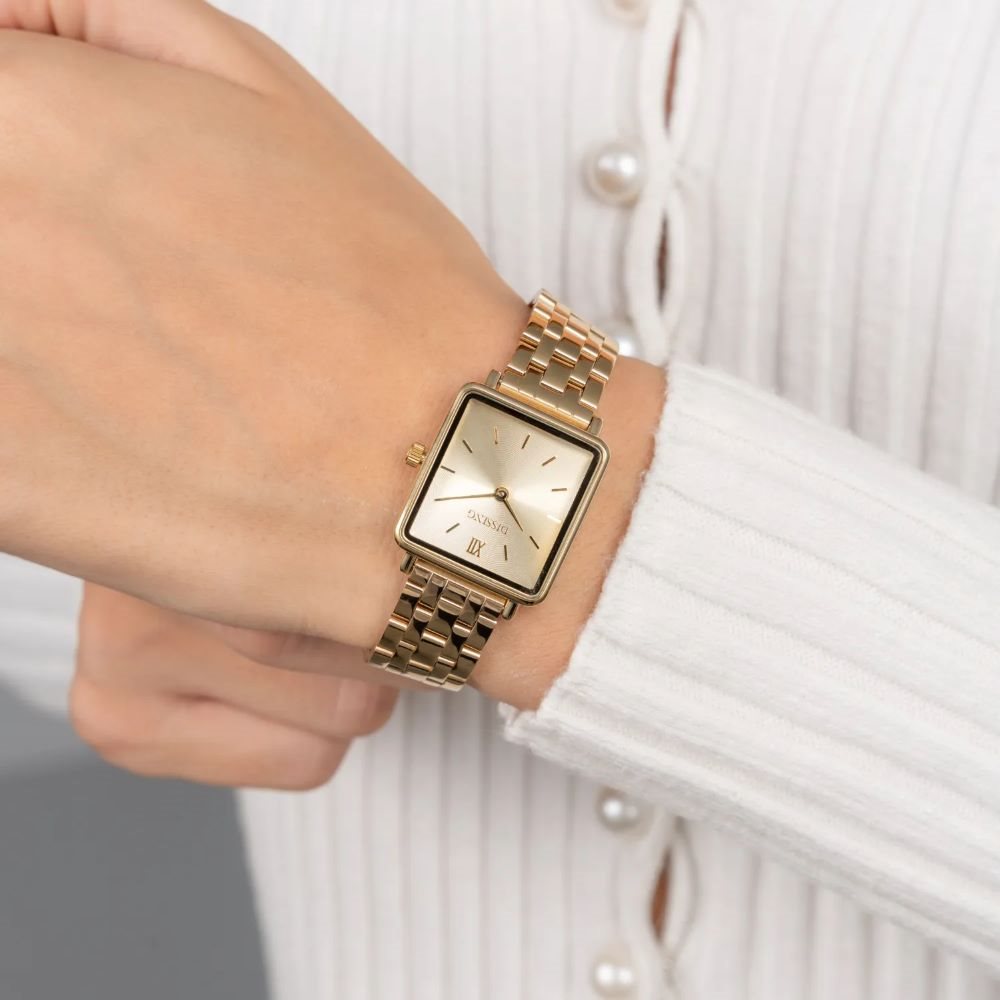 Dissing Square D1754 fra Dissing Square-kollektionen skiller sig ud med sin karakteristiske firkantede urkasse, der skaber et unikt look, der blander moderne og klassiske elementer. Med en kompakt diameter på 26 mm er dette ur designet til at gøre et subtilt statement på håndleddet. Urskiven er enkel, med slanke timemarkører og elegante visere, der giver et rent og elegant udseende. Den sammenhængende guldfarve på tværs af urskive, urkasse, bezel og stål-lænke tilføjer et strejf af elegance til det samlede design.