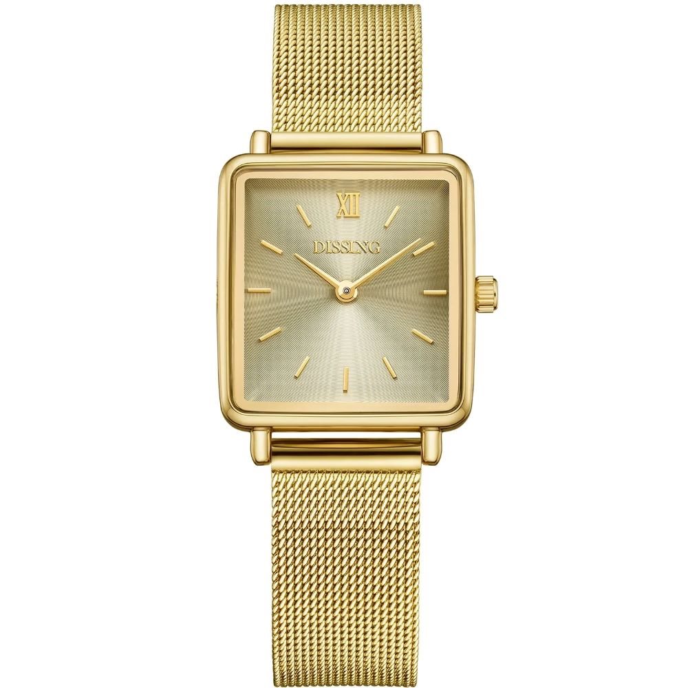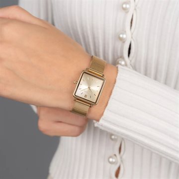 Dette ur fremviser en sammenhængende gylden farve på tværs af urskiven, urkassen, bezel og mesh lænken i rustfrit stål, hvilket skaber et ensartet og stilfuldt udseende. Med en diameter på 26 mm tilbyder det en perfekt balance mellem diskretion og tilstedeværelse på håndleddet. Udstyret med en butterfly lås sikrer uret en sikker pasform. Med en vandtæthed på 5 ATM er det ideelt til daglig brug. Det safirbelagte glas forbedrer ridsemodstand og opretholder klarhed.