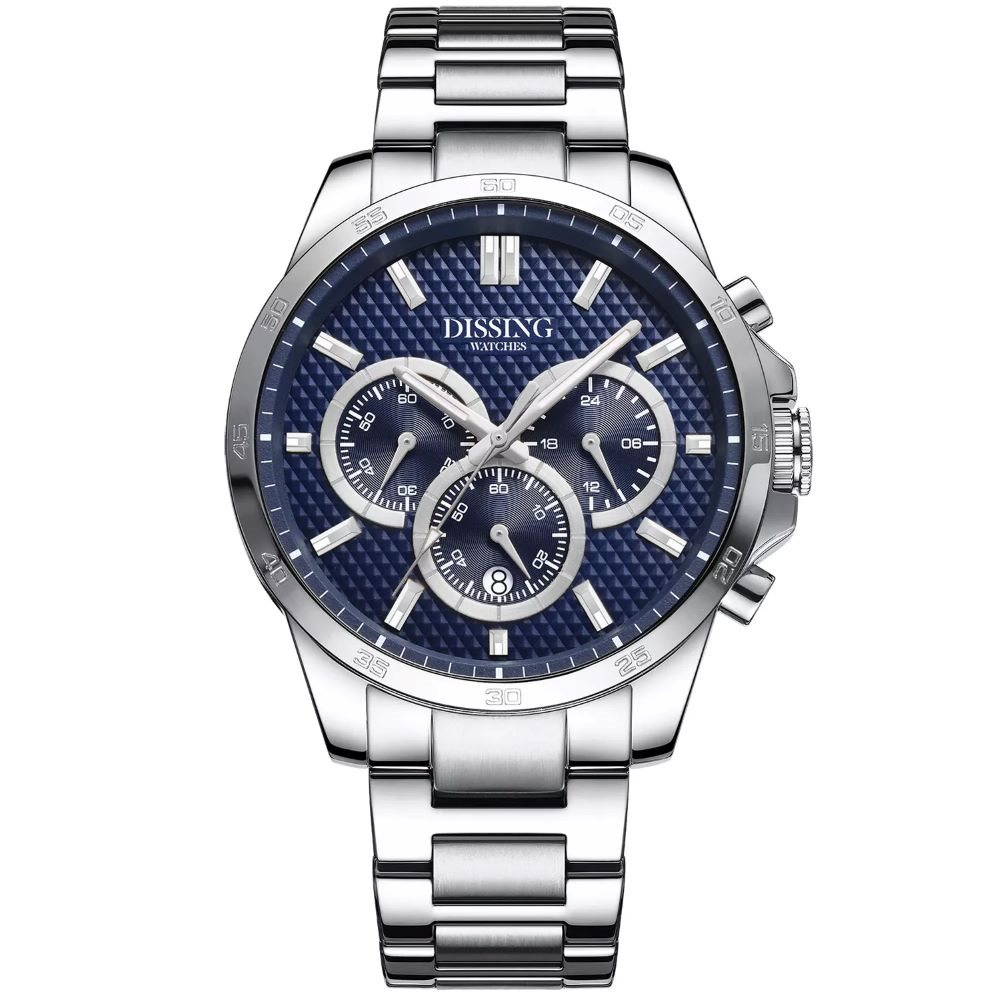 Dissing Tuatara D1001 skiller sig ud med sin runde urkasse og teksturerede urskive, der skaber et imponerende look. Urskiven har tre kronografer, der giver et balanceret og funktionelt design. Fremtrædende timemarkører og slanke visere forbedrer det moderne udseende. Den solide stål-lænke i en sammenhængende sølvfarve tilføjer til det robuste og stilfulde udseende, sikret med en foldelås for nemhed og pålidelighed.