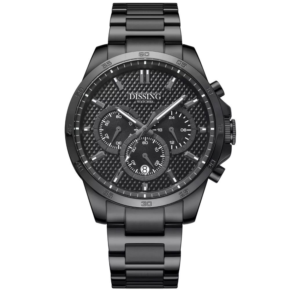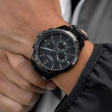Dissing Tuatara D1548 er et imponerende ur med et moderne og stilrent look. Det har en rund urkasse med en detaljeret urskive, der tilføjer dybde og interesse. Uret er prydet med flere kronografer, hvilket giver et struktureret og dynamisk udseende. Det helsorte design, inklusive urskive, urkasse, bezel og stål-lænke, skaber et dristigt og samlet look. Urens lænke komplementerer urkassen og tilbyder et ensartet design, mens foldelåsen sikrer en sikker pasform.