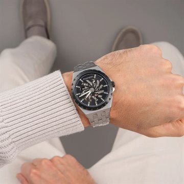 Med en diameter på 40 mm gør uret et stærkt indtryk på håndleddet, mens stål-lænken komplementerer det samlede udseende. Lænken er sikret med en foldelås, der giver nem brug. Uret er udstyret med safirbelagt mineralglas, som giver klarhed og beskyttelse. Med en vandtæthed på 5 ATM er det velegnet til daglige aktiviteter og beskytter mod stænk og kortvarig vandeksponering.