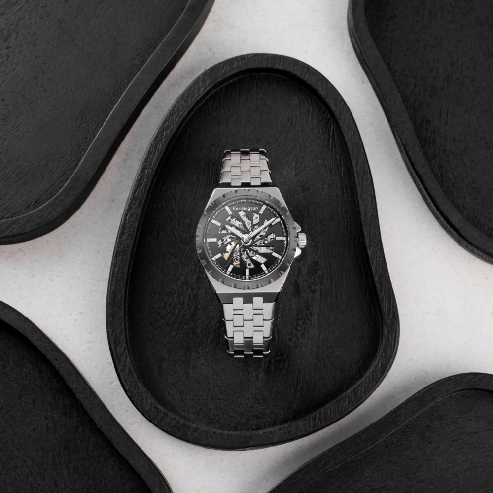 Kensington Infinity K0105 uret har en imponerende, rund urkasse med en karakteristisk cut-out urskive, der afslører de avancerede indre mekanismer nedenunder. Dets skeleton design fremviser det automatiske urværk, drevet af SEA-GULL TY2807 kaliberen. Urets sorte urskive og bezel skaber en iøjnefaldende kontrast til den sølvfarvede urkasse, hvilket tilføjer til dets moderne og imponerende design.