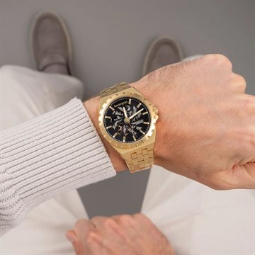 Dette ur har en sort urskive sat mod en guld urkasse, bezel og lænke, hvilket skaber en slående kontrast, der skiller sig ud. Den gyldne stål-lænke integreres med urkassen og sikres af en foldelås for en sikker pasform. Skeleton urskiven giver et gennemsigtigt udsyn, der forstærker dets moderne æstetik.