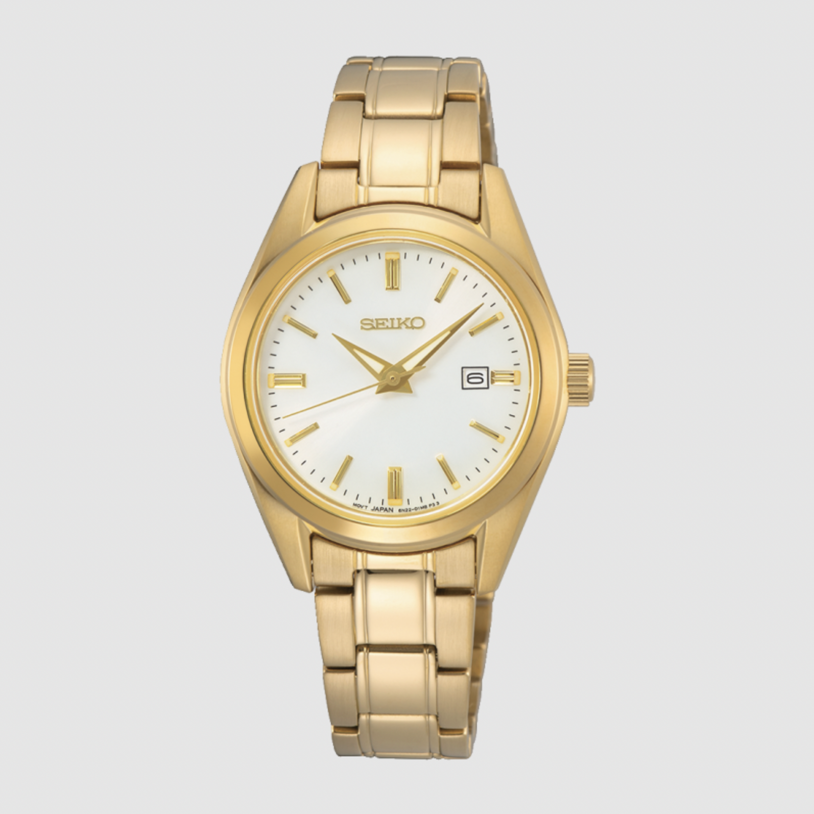 Uret har en 30 mm urkasse i rustfrit stål med guldfarvet finish, der fremhæver den hvide urskive på smukkeste vis. De slanke visere og timemarkører skaber et rent og letlæseligt udtryk, mens datovisningen giver ekstra funktionalitet. Den matchende guldfarvede lænke fuldender det stilfulde look og lukkes sikkert med en foldelås. Uret er udstyret med Seikos 6N22 kvartsurværk og beskyttet af safirglas for øget holdbarhed.