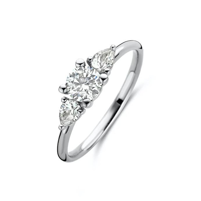 Den romantiske Palace ring er designet med to pære formede zirkonia samt en flot rund zirkonia i midten.