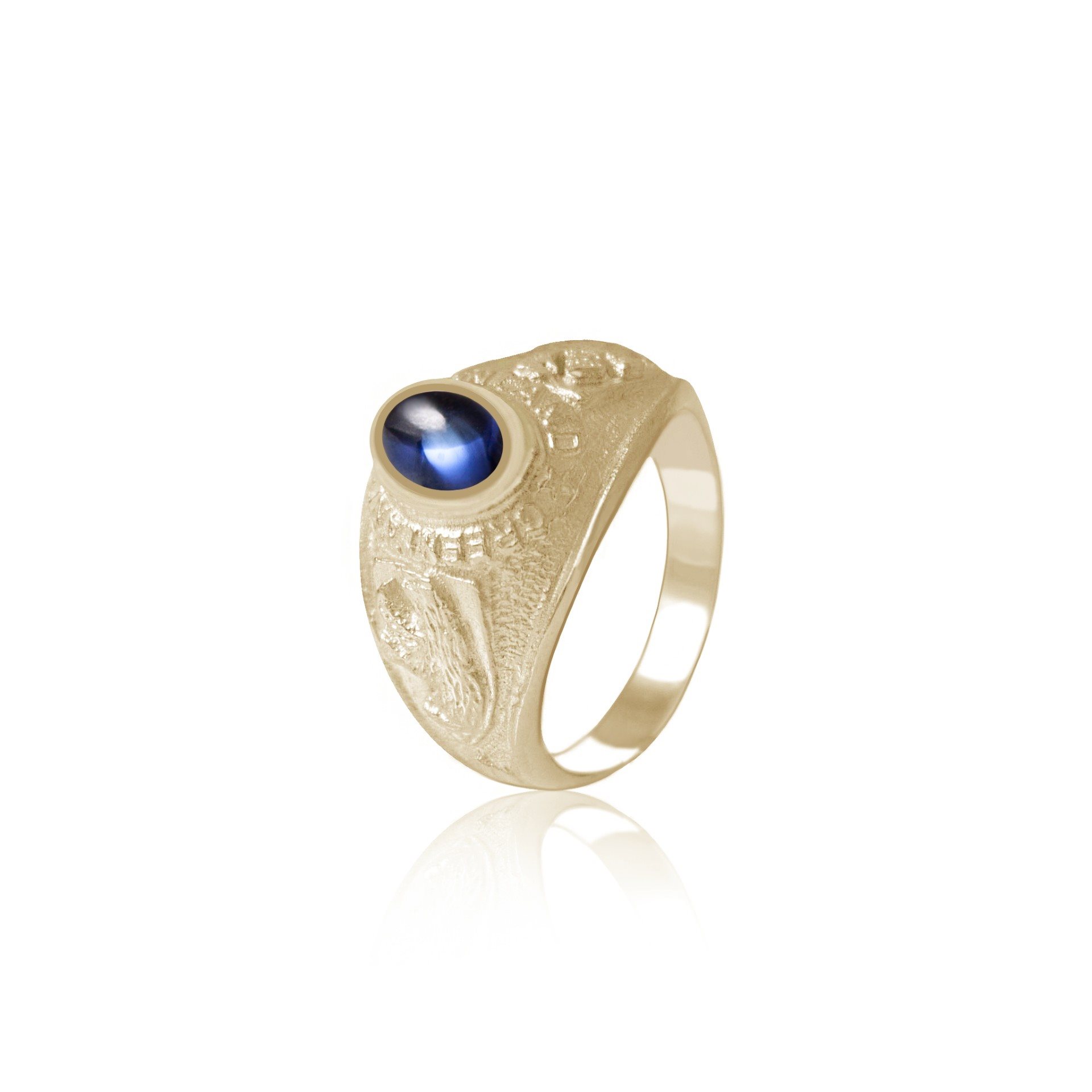 Ringen er smukt dekoreret med en cabochonslebet syntetisk blå safir, der giver et elegant og dybglødende udtryk. På hver side af ringen prydes designet af en isbjørn. Ringen kan fås i sterling sølv, 8 kt guld og 14 kt guld.